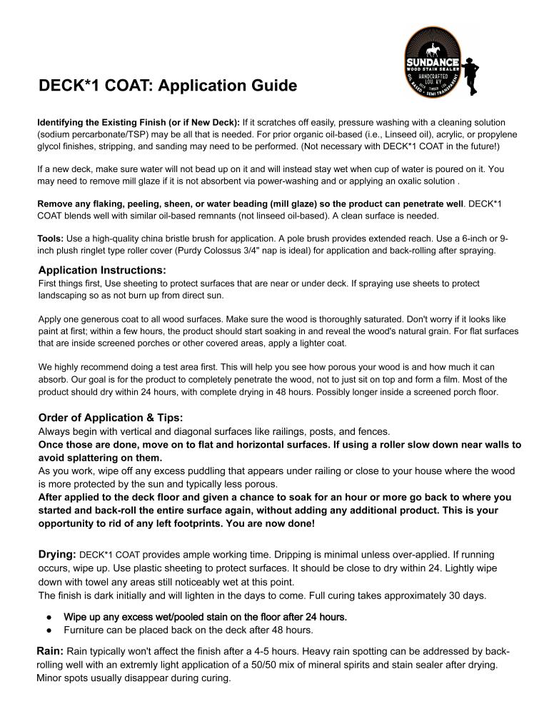 SUNDANCE COATINGS DECK* 1 COAT is a long oil alkyd resin, semi-transparent, high-value log stain-sealer formulated and crafted to penetrate, protect, make beautiful, and last for extended years on your Log Home in all climates and temps! It is a more substantive product that outlasts the others!