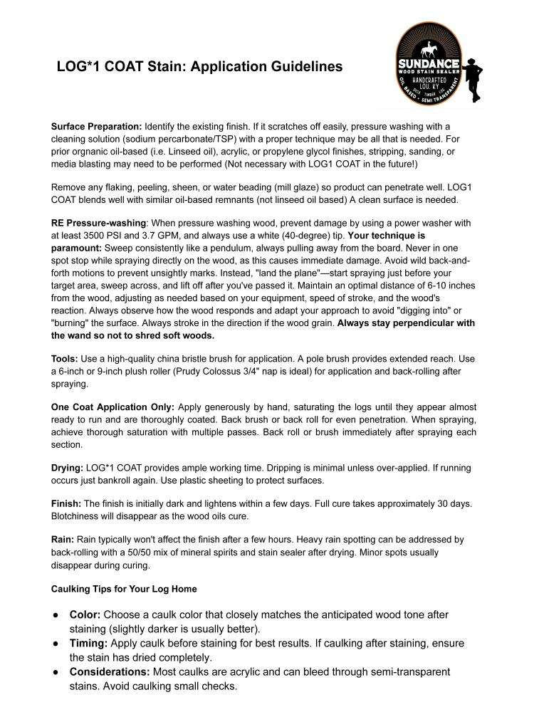 SUNDANCE LOG* 1 COAT is a long oil alkyd resin, semi-transparent, high-value log stain-sealer formulated and crafted to penetrate, protect, make beautiful, and last for extended years on your Log Home in all climates and temps! Sold in 5 gallon pails only.